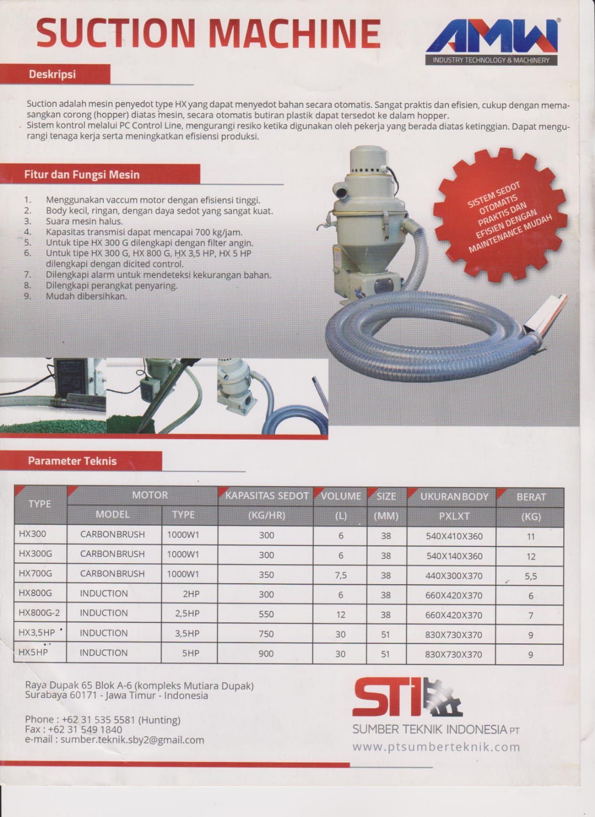 Suction adalah mesin penyedot type HX yang dapat menyedot bahan secara otomatis. Sangat praktis dan efisien, cukup dengan mema- sangkan corong (hopper) diatas mesin, secara otomatis butiran plastik dapat tersedot ke dalam hopper. Sistem kontrol melalui PC Control Line, mengurangi resiko ketika digunakan oleh pekerja yang berada diatas ketinggian. Dapat mengu- rangi tenaga kerja serta meningkatkan efisiensi produksi.